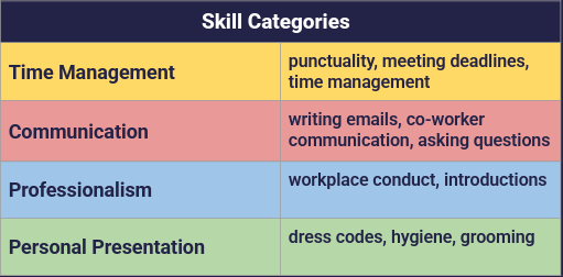 The module focuses on four core areas of professional readiness: time management, communication, professionalism, and personal presentation. These skills are introduced through realistic moments that ask learners to think about punctuality, deadlines, email behavior, workplace introductions, meeting conduct, dress expectations, hygiene, and how to interact appropriately with coworkers and supervisors.