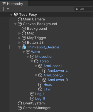 The ThinRabbit_Georgie prefab is built as a fully articulated 2D sprite character, where each major body part is a separate child object. This setup allows for realistic movement by rotating parts around carefully placed pivot points. The torso pivots at the waist, arms pivot at the shoulders and elbows, and the jaw pivots at the hinge of the mouth. By breaking the character into these components, you can animate the rabbit lunging, swinging its arms, tilting its head, and snapping its jaw.